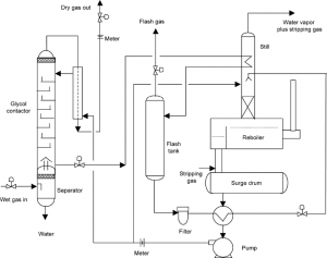 Figure 1 below is a diagram of a typical basic glycol dehydrator process flow diagram from https://petrowiki.org/Dehydration_with_glycol